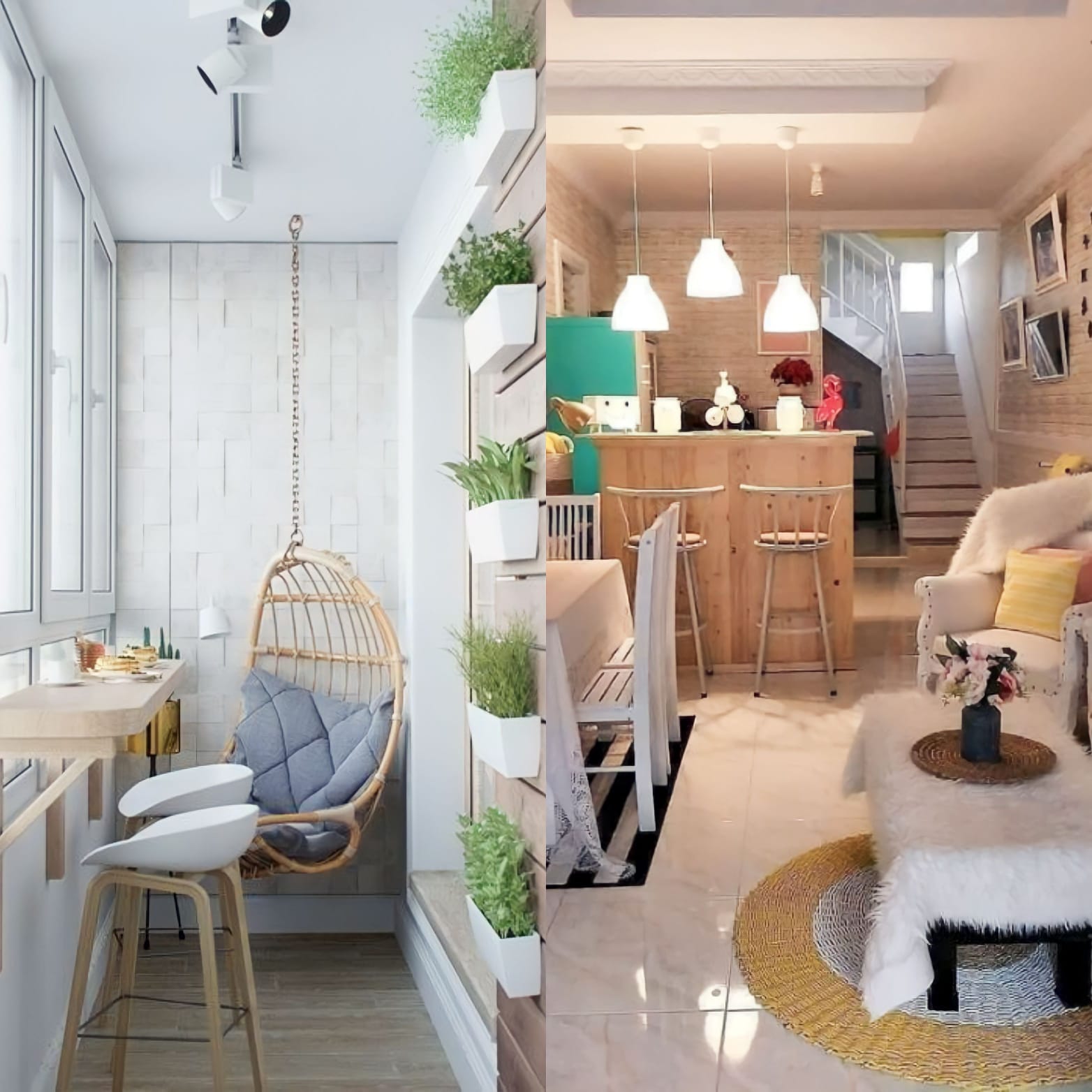 - Sentuhan vintage melalui lampu gantung klasik, cermin antik, atau tanaman hias dalam pot klasik.