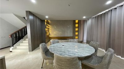 Kamar tidur (bedroom) dengan berbagai jenis bantal dilengkapi dengan TV sebagai media entertainment, cabinet yang juga berfungsi sebagai ambalan meja. dilengkapi dengan nakas yang berfungsi dengan baik, warna netral (neutral color) dengan undertone warna earthy memberikan efek nyaman dan homy tetapi tetap warm.