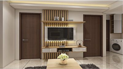 Anda bisa melihat wall panel diruangan ini yang menyatu dengan cabinet yang berbentuk simpel, yang demikian itu merupakan ciri dari interior design minimalis.