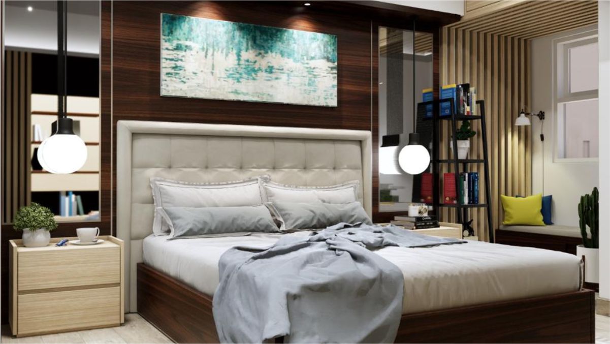 penggunaan warna-warna yang earthy pada furniture merupakan salah satu ciri dari gaya design interior modern, bed dengan dilapisi busa yang merupakan bahan-bahan material design yang populer trend saat ini adalah bukti bahwa design interior untuk kamar tidur ini mengikuti gaya Design Interior Modern Minimalis.