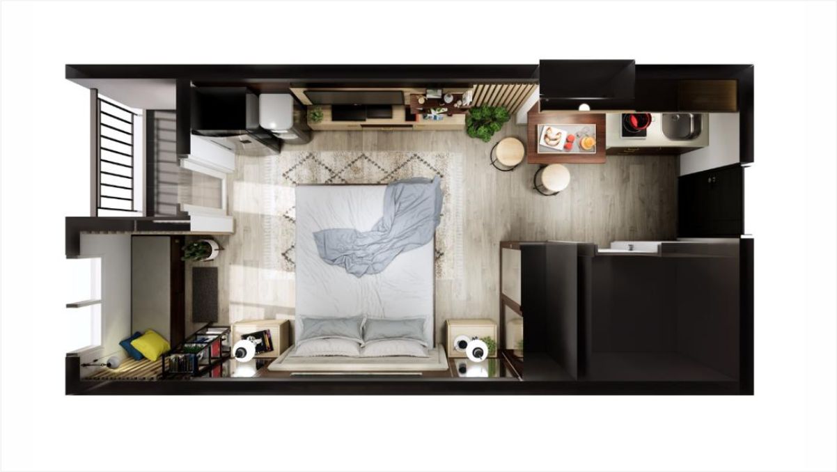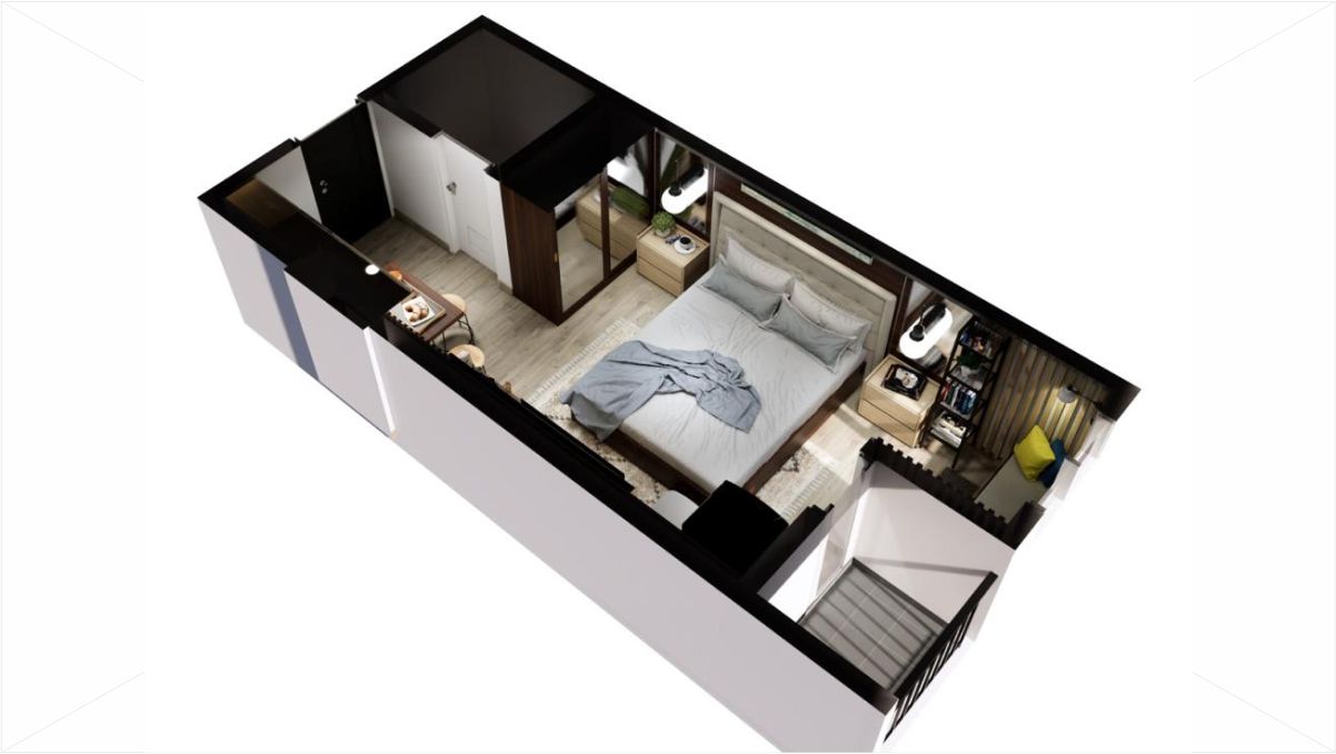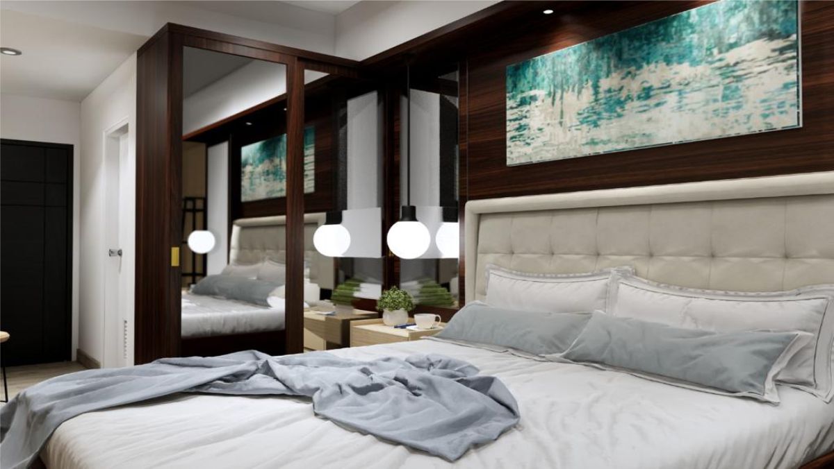 Penggunaan Color Theme Dark Warm ditujukan untuk memberikan kesejukan tetapi dengan sedikit sentuhan kehangatan untuk menambah sugesti yang mengarah pada motivasi diri. Nakas di sebalah kanan dan kiri memudahkan penghuni kamar ini untuk meletakkan benda-benda kesayangannya, atau peralatan darurat lainnya.