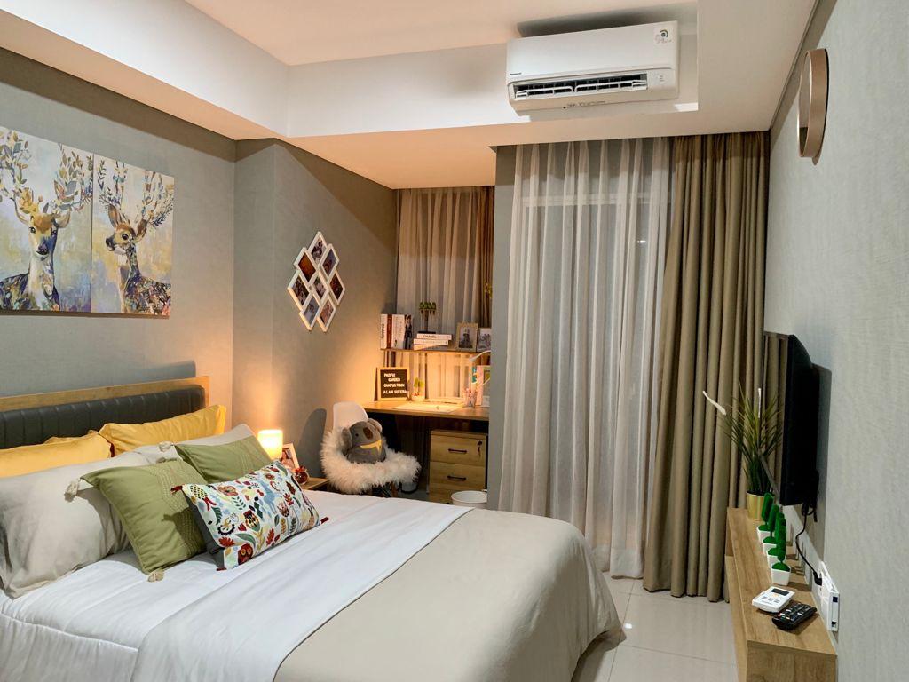 Meja yang berfungsi sebagai nakas dan Laci disebelah kamar tidur memungkinkan anda meletakkan barang-barang yang melekat pada diri anda, misalnya gadget, buku bahkan mungkin obat-obatan. Selain itu peralatan darurat ketika pada saat mati lampu semisal Lampu senter (torch), korek api dan lilin bisa anda letakkan di laci tersebut. TV yang berada dihadapan bantal memungkinkan anda bersantai (leyeh-leyeh) sambil menikmati entertainment sebelum akhirnya anda tertidur. Ini adalah salah satu karya Design Interior Hotindojaya dalam membuat Interior Design Bedroom (kamar tidur) untuk Client yang tinggal di Apartemen Green Pramuka, Jakarta Timur.