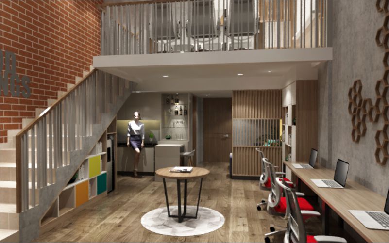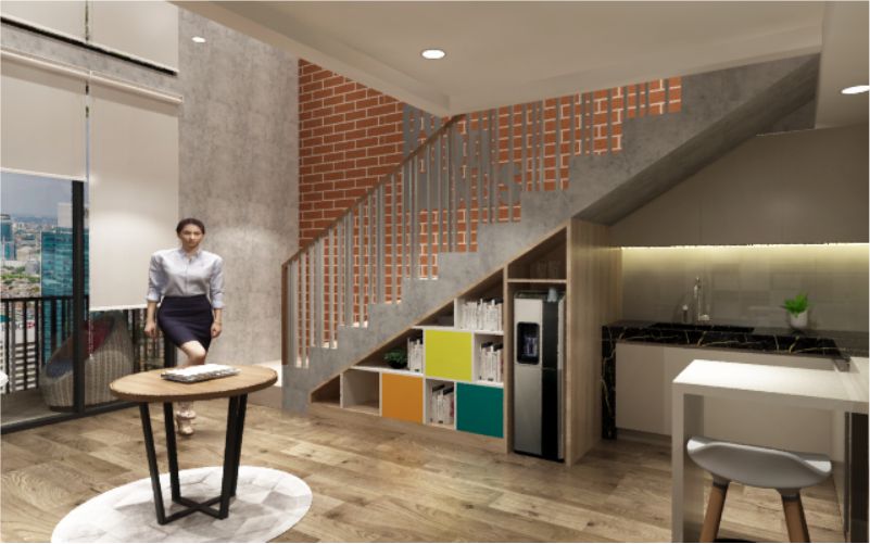 Pada awalnya anda bisa melihat bahwa Ruangan ini menggunakan interior dan furniture bergaya Design Interior Minimalis, bentuk-bentuk furniture yang sederhana bisa anda lihat di bagian kabinet dan meja, tetapi kemudian menghadirkan furniture yang tidak sederhana lagi dengan bahan-bahan metal yang biasa dipakai dalam Design Interior Modern, anda juga bisa melihat Open Brick yang ada di samping tangga yang biasanya bisa anda temukan pada Interior Design Industrial melihat dari semua percampuran itu maka penulis berpendapat bahwa ini adalah Design Interior Minimalis Modern.