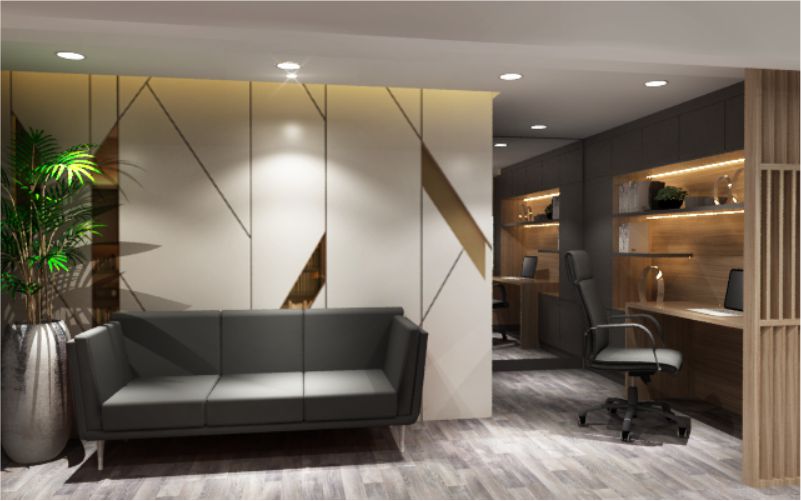 Ruangan ini menggunakan Warna-warna Bumi (Earthy Tones) dengan penggunaan warna dominnam brown untuk menciptakan nuansa sejuk dan soothing, ditunjang dengan lighting yang netral yaitu berwarna putih netral sehingga pengguna ruangan ini mendapatkan clarity yang tinggi dan suasana yang segar, lebih lengkap tentang lighting anda bisa baca artikel tentang Skala Temperatur Warna.