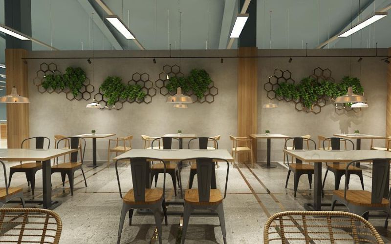 Tapi jika dilihat lagi anda akan melihat kursi yang ada pada design cafe ini tidak simpel, bahkan menggunakan material yang mengedepankan bare metal color sebagai elemen utamanya, hal ini sejalan dengan elemen-elemen yang ada pada aliran interior design modern dimana material dan bentuk mengikuti tren suatu jaman yang dikehendaki, walaupun begitu anda akan melihat daun-daun yang melambai di atap cafe ini seolah menggambarkan tema bahwa cafe ini berada di suatu daerah perkebunan atau pertanian terpencil yang menyatu dengan alam. so bagi penulis ini adalah salah satu manifestasi dari interior design farm house, ditambah material utama yang digunakan untuk menjadi focus pada design ini adalah Wood (kayu) semakin menambah kekentalan nuansa interior design farm house.