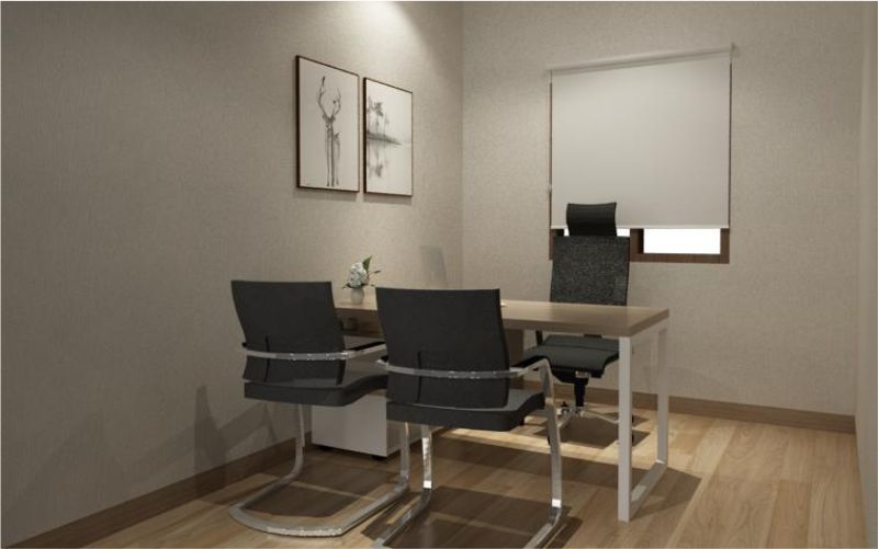 ini adalah ruangan kerja dan ruang meeting, yang berfungsi dengan baik, anda bisa melakukan presentasi disini dengan layar slideshow yang telah disediakan atau hanya sekerja mencorat-coret draft saja, dan anda bisa menyimpan semua barang-barang yang dibutuhkan dalam cabinet yang tersedia.