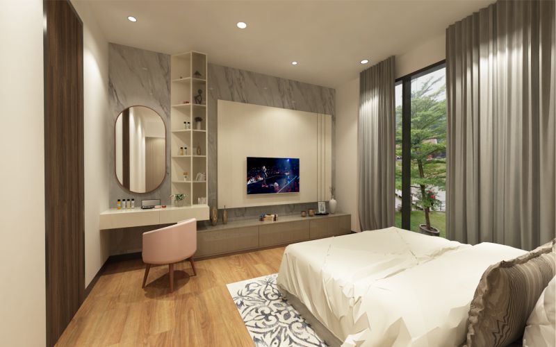 Bentuk furniture yang simpel yang mengutamakan space availability adalah salah satu jargon dari Design Interior Minimalis, clean line yang memisahkan satu elemen dengan elemen yang lain juga merupakan bagian dari interior design minimalis, tetapi ada yang beda dengan kursi yang ada di depan meja rias, bentuknya tidak sederhana dengan kaki kursi yang mengangkang seperti kaki kursi yang digunakan pada zaman imperialis, walaupun begitu kursi ini tidak merusak bahkan masuk ke dalam keseluruhan design, percampuran gaya design interior seperti ini biasanya digunakan dalam interior design Design Interior Minimalis Modern yaitu dimana interior design minimalis diimbuhi dengan material yang populer pada suatu zaman tertentu.