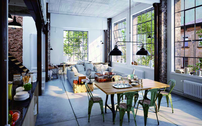 Yang paling mencolok dari desain interior industrial adalah Open concept layout, atap yang tinggi, material dinding yang terbuka, percampuran antara barang-barang usang dan baru
