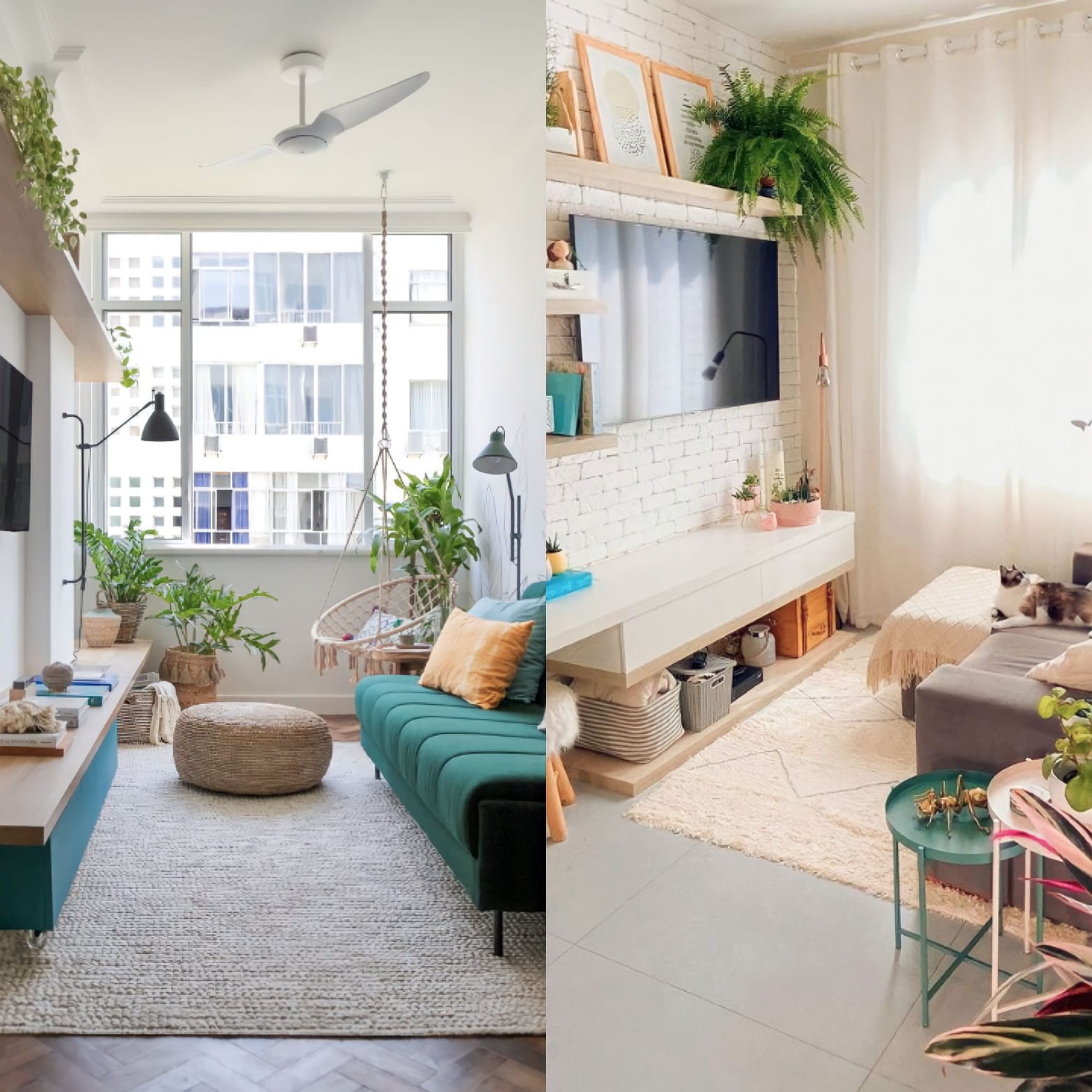 Apartment ini memiliki suasana alam dengan dinding-dinding berwarna tanah dan banyak tanaman gantung di seluruh ruangan. Di sudut ruang tamu, terdapat dinding vertikal yang dihiasi dengan rak-rak terbuka yang menampilkan koleksi tanaman sukulen yang beragam. Jendela-jendela besar memungkinkan cahaya alami masuk ke dalam ruangan, dan tirai tipis memberikan privasi sambil membiarkan sinar matahari masuk.