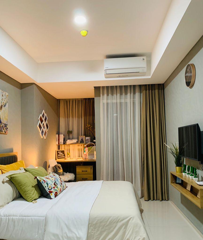 Meja yang berfungsi sebagai nakas dan Laci disebelah kamar tidur memungkinkan anda meletakkan barang-barang yang melekat pada diri anda, misalnya gadget, buku bahkan mungkin obat-obatan. Selain itu peralatan darurat ketika pada saat mati lampu semisal Lampu senter (torch), korek api dan lilin bisa anda letakkan di laci tersebut. TV yang berada dihadapan bantal memungkinkan anda bersantai (leyeh-leyeh) sambil menikmati entertainment sebelum akhirnya anda tertidur. Ini adalah salah satu karya Design Interior Hotindojaya dalam membuat Interior Design Bedroom (kamar tidur) untuk Client yang tinggal di Apartemen Green Pramuka, Jakarta Timur.