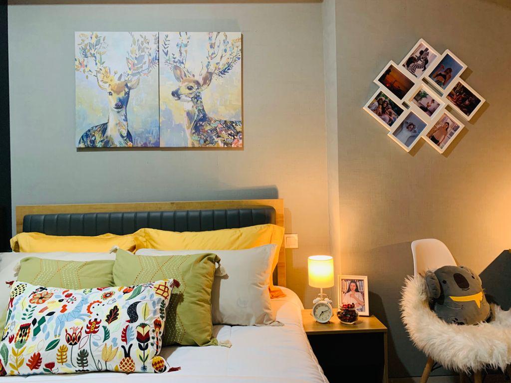 warna bantal yang selaras dengan hiasan dinding membuatnya menjadi perfect match untuk design kamar yang layak ditinggali.