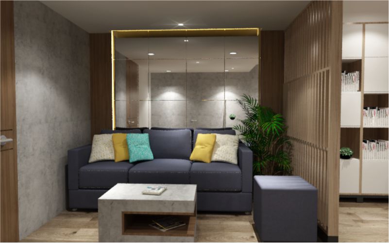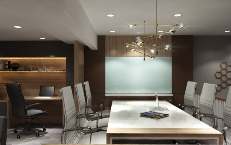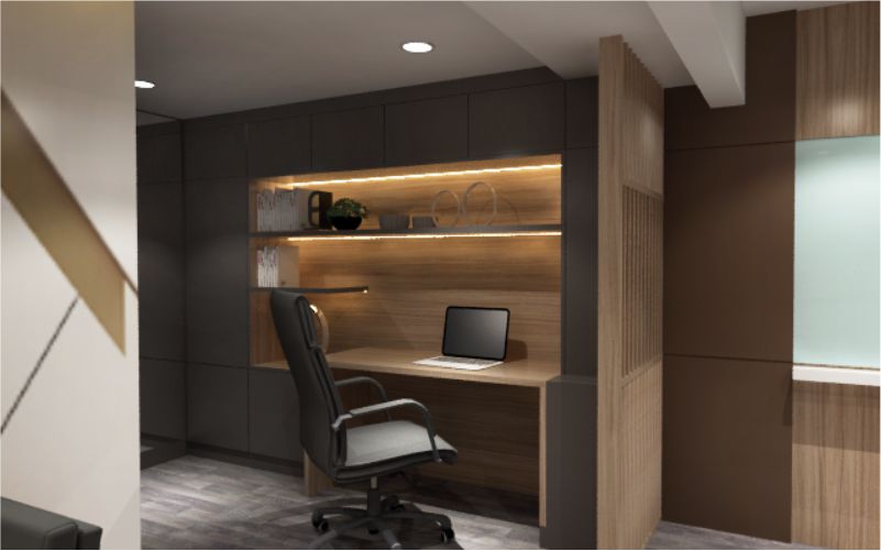 Ruangan ini menggunakan Warna-warna Bumi (Earthy Tones) dengan penggunaan warna dominnam brown untuk menciptakan nuansa sejuk dan soothing, ditunjang dengan lighting yang netral yaitu berwarna putih netral sehingga pengguna ruangan ini mendapatkan clarity yang tinggi dan suasana yang segar, lebih lengkap tentang lighting anda bisa baca artikel tentang Skala Temperatur Warna.