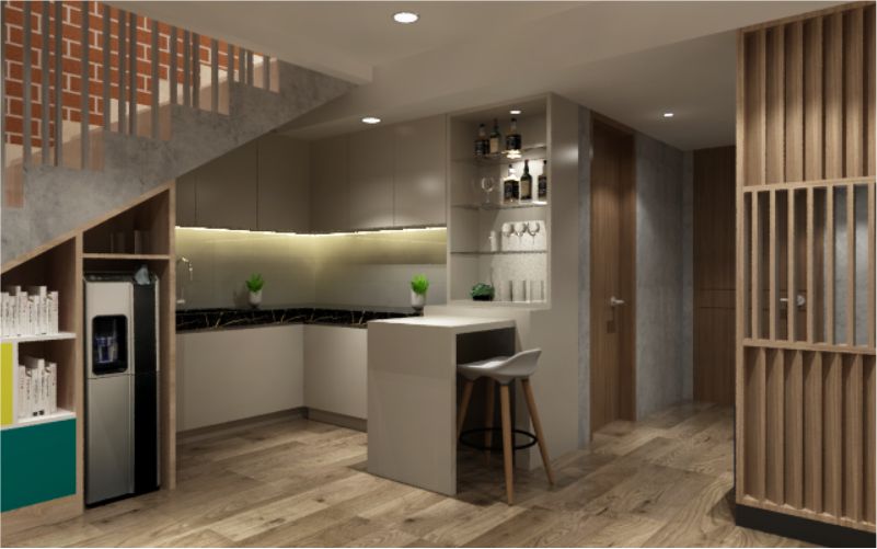 Pada awalnya anda bisa melihat bahwa Ruangan ini menggunakan interior dan furniture bergaya Design Interior Minimalis, bentuk-bentuk furniture yang sederhana bisa anda lihat di bagian kabinet dan meja, tetapi kemudian menghadirkan furniture yang tidak sederhana lagi dengan bahan-bahan metal yang biasa dipakai dalam Design Interior Modern, anda juga bisa melihat Open Brick yang ada di samping tangga yang biasanya bisa anda temukan pada Interior Design Industrial melihat dari semua percampuran itu maka penulis berpendapat bahwa ini adalah Design Interior Minimalis Modern.