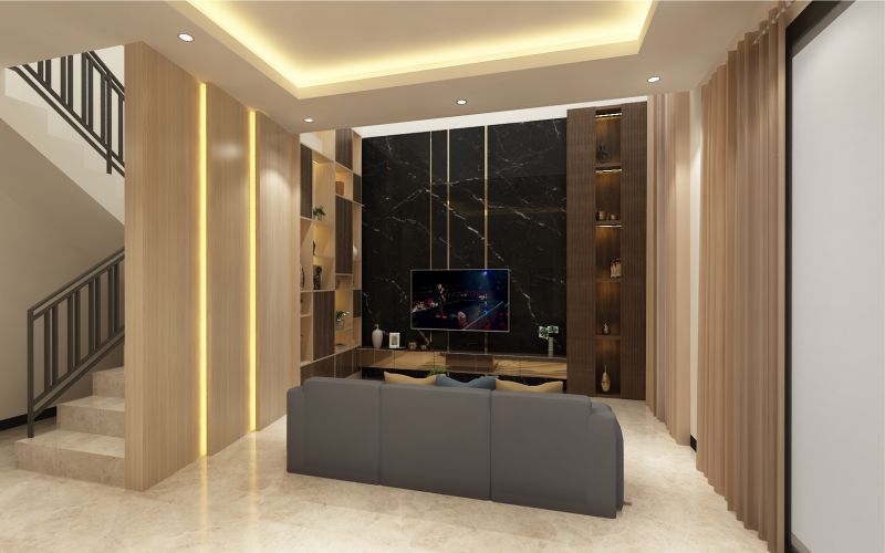 Kemudian jika kita menilik pada ruang tamu (living room), anda akan mendapatkan nuansa warm yang begitu kental, apalagi tidak terlihat ada daylight disini, neutral color dan earthy tone dengan undertone brown mendominasi setiap sudut ruangan, brown adalah bagian dari warna warm sehingga tidak heran jika ruangan ini didominasi oleh nuansa warm, walaupun begitu warna hitam di dinding memberikan aspek seperti pendingin untuk mata kita, sehingga nuansa warm ini tidak menjadi berlebihan sehingga terkesan terlalu panas dan humid (gerah).
